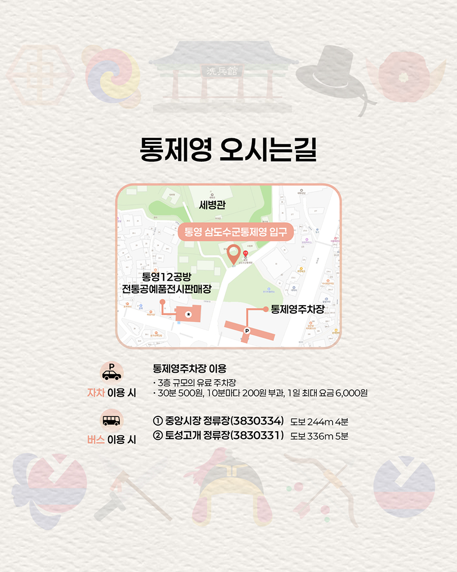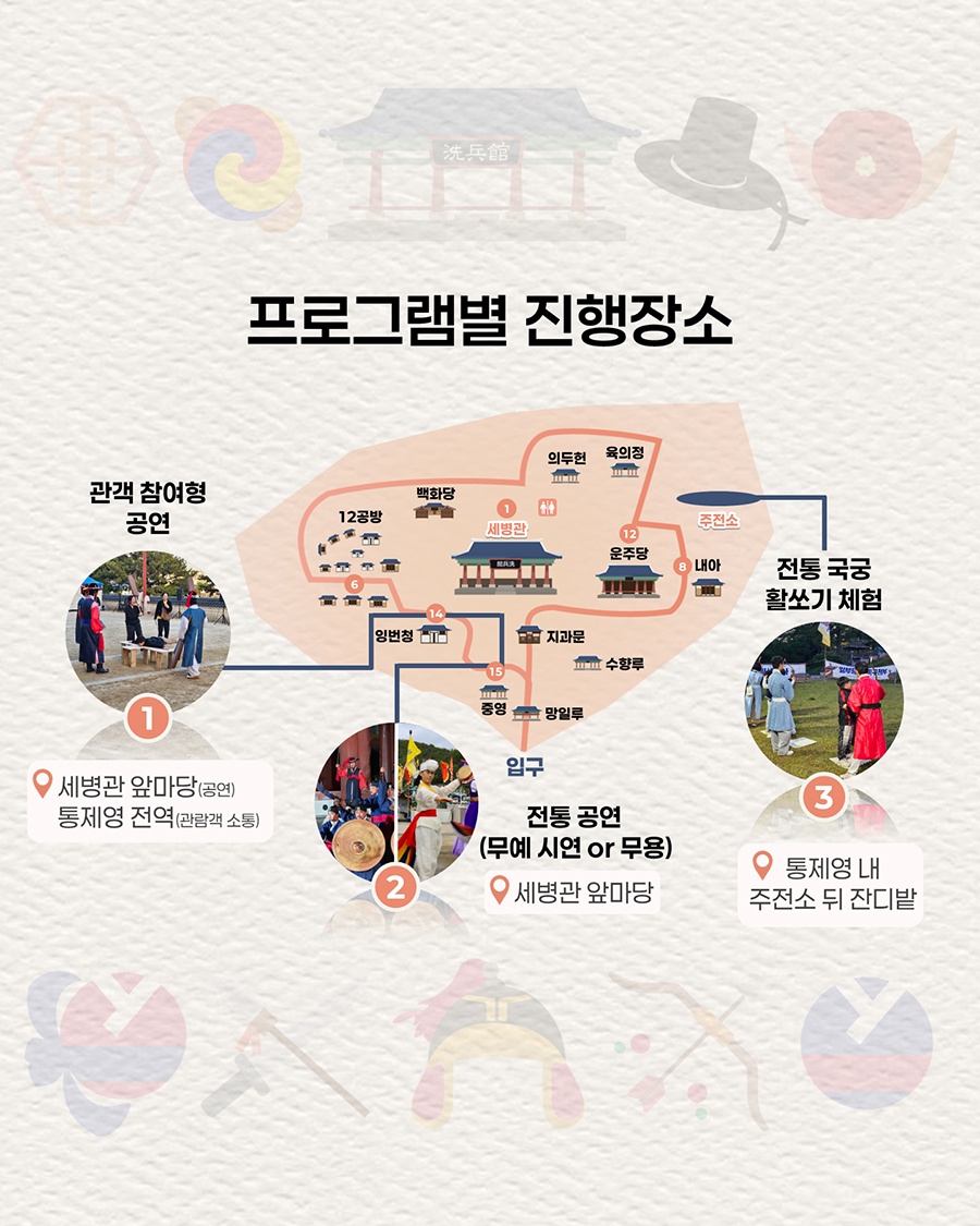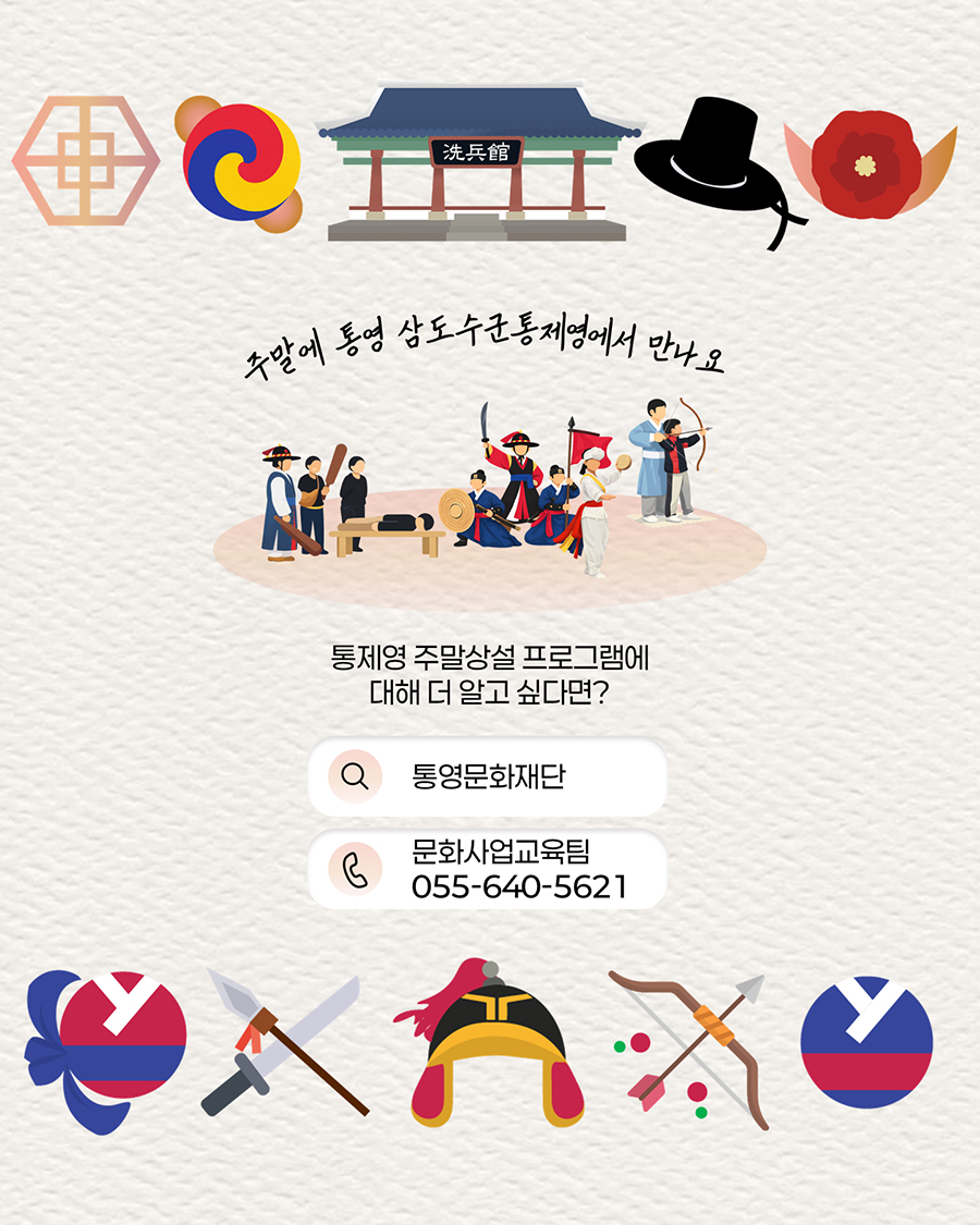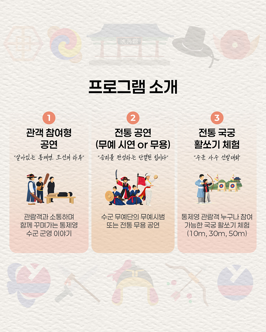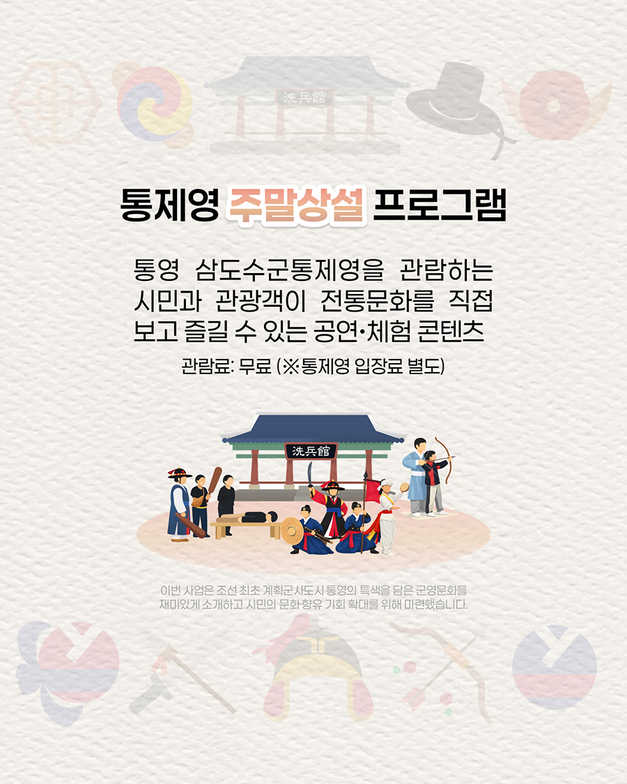 주요내용 : 통영 삼도수군통제영을 관람하는 시민과 관광객이 전통문화를 직접 보고 즐길 수 있는 공연, 체험 콘텐츠