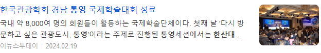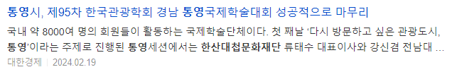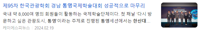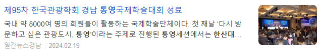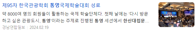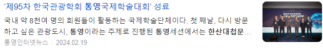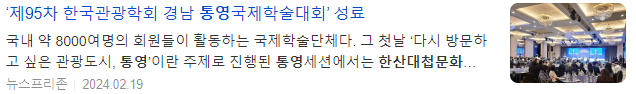 통영시와 경상남도가 후원하고 한국관광학회가 주최하는 '제95차 한국관광학회 경남 통영국제학술대회'가 국내·외 관광 전문가와 학생 등 400여 명이 참석한 가운데 지난 15~16일 이틀간 통영스탠포드호텔을 비롯한 지역 일원에서 개최됐다.