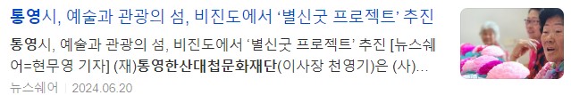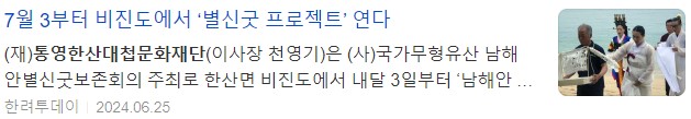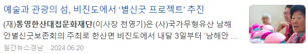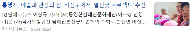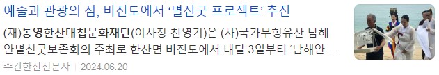 (재)통영한산대첩문화재단(이사장 천영기)은 (사)국가무형유산 남해안별신굿보존회의 주최로 한산면 비진도에서 내달 3일부터 ‘남해안 섬길굿’ 일환으로 전시, 투어, 공연 등 다양한 프로그램을 운영한다.