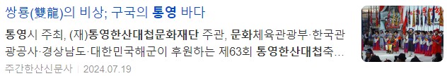 통영시 주최, (재)통영한산대첩문화재단 주관, 문화체육관광부·한국관광공사·경상남도·대한민국해군이 후원하는 제63회 통영한산대첩축제가 8월 9~14일 ‘쌍룡(雙龍)의 비상; 구국의 통영 바다’라는 주제로 통영시 강구안, 한산대첩광장, 당포 선착장, 이순신공원, 도남 관광단지, 무전대로, 내죽도 공원 등에서 개최된다.