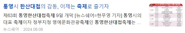 통영시의 대표 축제이자 정부지정 명예문화관광축제인 통영한산대첩축제는 이순신 장군이 임진왜란 때 한산도 앞바다에서 왜적 수군을 상대로 대승을 거둔 '한산대첩'을 기념하는 축제로 한산대첩 승전일인 1592년 음력 7월 8일(양력 8월 14일)에 맞춰 매년 한여름인 8월에 열린다.