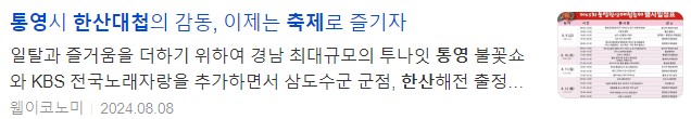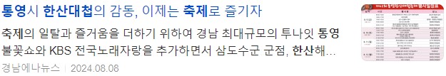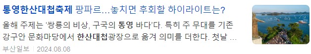 특히 통영한산대첩축제의 대표행사인‘한산대첩 재현’은 8월 13일 화요일 저녁 5시 30분부터 승리의 현장인 한산도 앞바다를 품은 통영 이순신공원에서 펼쳐진다.