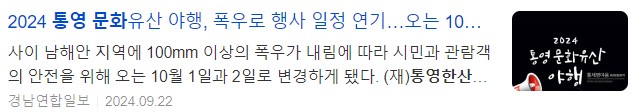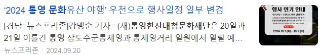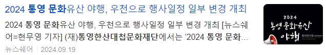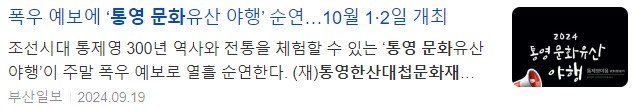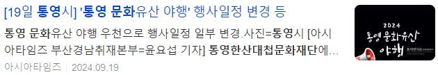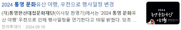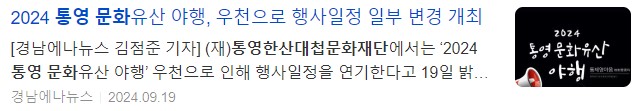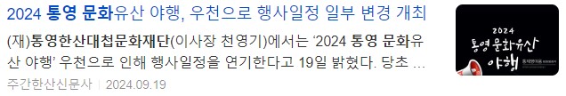 (재)통영한산대첩문화재단(이사장 천영기)에서는 ‘2024 통영 문화유산 야행’ 우천으로 인해 행사일정을 연기한다고 19일 밝혔다.