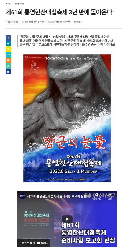 [한산신문] 제61회 통영한산대첩축제 3년 만에 돌아온다