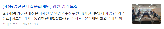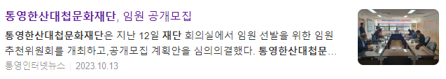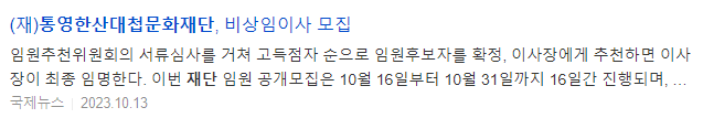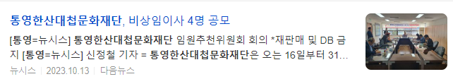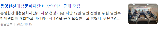 이번 재단 임원 공개모집은 오는 16일부터 10월 31일까지 16일간 진행되며, 자세한 사항은 (재)통영한산대첩문화재단과 통영시 홈페이지, 지방공공기관 통합채용정보공개시스템 등을 참고하면 된다.
