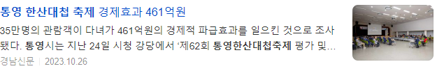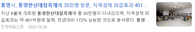 제62회 통영한산대첩축제가 약 35만명의 관광객을 유인하면서 461억원의 지역경제 파급효과를 거둔 것으로 나타났다.