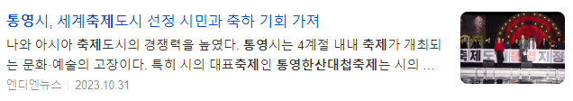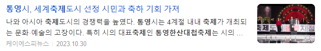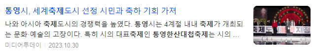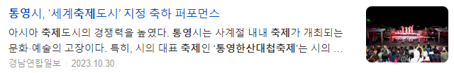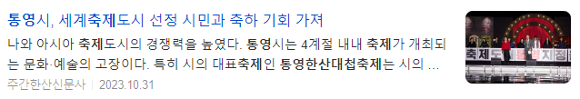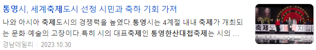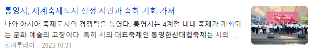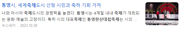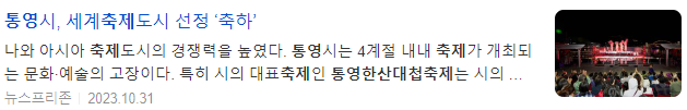 통영시는 지난 11일(미국현지시간) 미국 텍사스주 매캘런시에서 개최된 제66회 세계축제협회 연차총회에서 '세계축제도시'로 선정됐다. 대한민국 통영시를 포함해 태국 수코타이주, 미국 펜실베니아주 필라델피아, 미국 텍사스주 매캘런 총 4개 도시가 2023 세계축제도시에 선정되면서 전체 세계축제도시 중 절반이 아시아권에서 나와 아시아 축제도시의 경쟁력을 높였다.