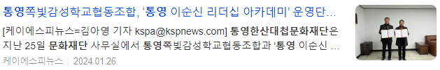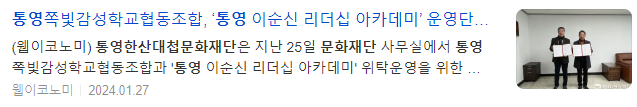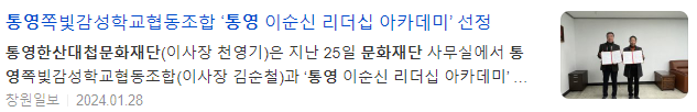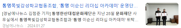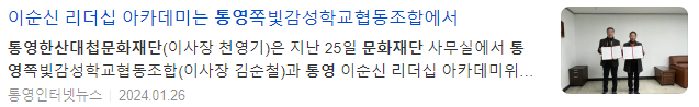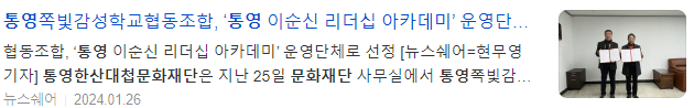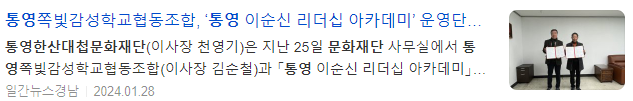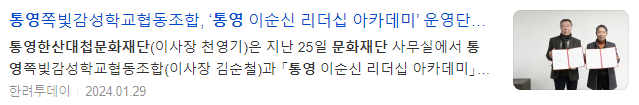 한편, 향후 2년간 「통영 이순신 리더십 아카데미」를 위탁운영을 맡은 쪽빛감성학교협동조합은 수익금 일부를 사회공헌 사업으로 환원하기 위해 통영한산대첩문화재단과 지역의 문화예술 사업 발굴 및 추진하기로 합의했다.
