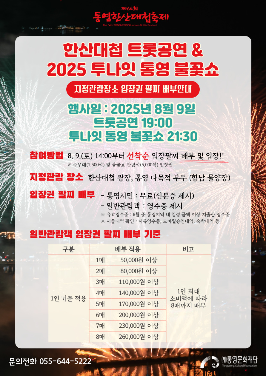 ![]() ◆ 행사명 : 트롯콘서트 및 2025 투나잇 통영 불꽃쇼 ◆ 참여방법 : 8. 9.(토) 14:00부터 선착순 입장팔찌 배부 및 입장 ※ 주무대(1,500석) 및 불꽃쇼 관람석(5,000석) 입장권 ◆ 행사일시 : 2025. 8. 9.(토) 19:00 ~ 22:00 ◆ 장소 : 통영한산대첩광장 주무대, 항남 물양장(부두) ◆ 주요행사 : 한산대첩 트롯공연 & 드론불꽃쇼 & 투나잇 통영 불꽃쇼 ◆ 입장권 팔찌 배부 - 통영시민 : 무료(신분증 제시) - 일반관람객 : 영수증 제시 ※ 유효영수증 : 8월 중 통영지역 내 일정 금액 이상 지출한 영수증 ※ 지출내역 확인 : 지류영수증, 모바일승인내역, 숙박내역 등 ◆ 일반관람객 입장권 팔찌 배부 기준