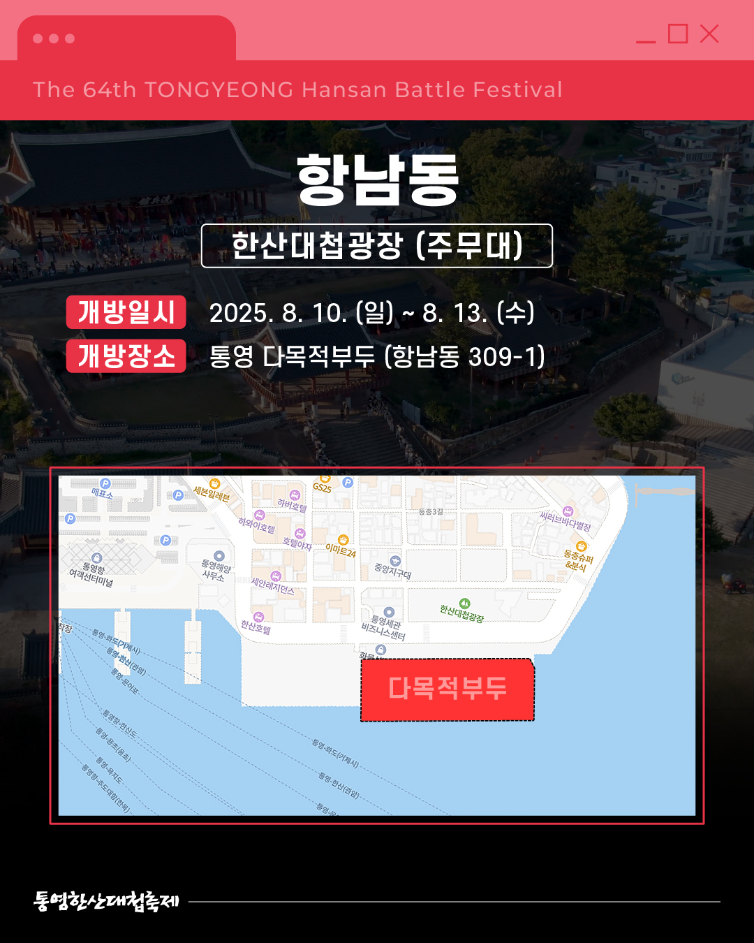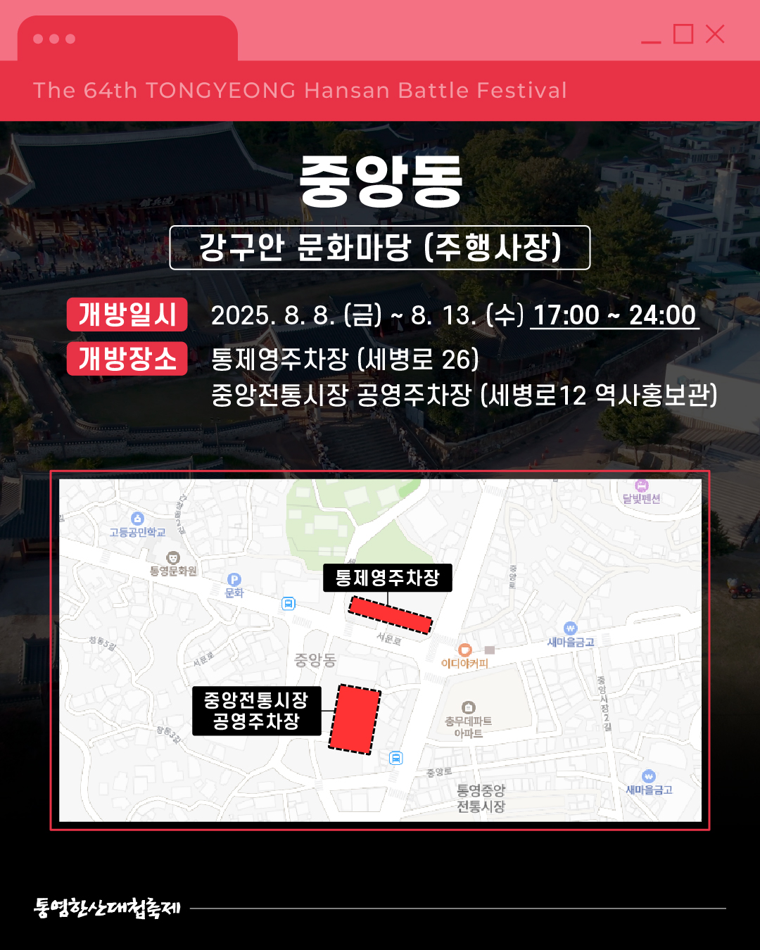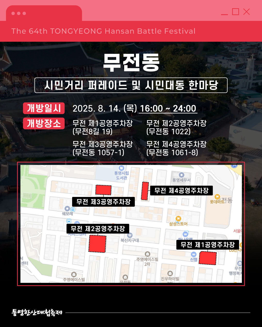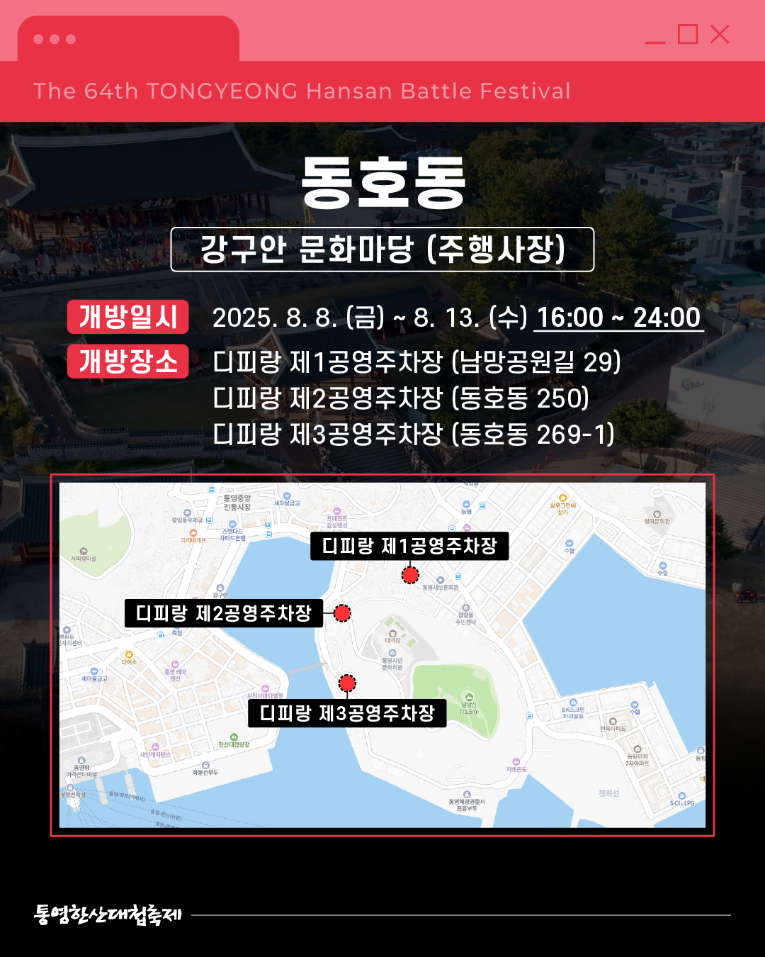 ![]() ![]() ![]() ![]() ![]() ![]() ![]() ![]() [제64회 한산대첩축제] 한산대첩축제 임시주차장 안내 쾌적한 관람을 위한 임시주차장 정보를 알려드립니다 행사장 별로 마련된 주차장을 미리 확인하고, 넉넉한 주차와 함께, 축제를 즐겨보세요 8. 8. (금) ~ 8. 9. (토) - 광도면 죽림리 : 구 국민은행 통영 죽림점 뒤 공터 8. 8. (금) ~ 8. 13. (수) 16:00~24:00 - 동호동 : 디피랑 제1~3공영주차장 8. 8. (금) ~ 8. 13. (수) 17:00~24:00 - 중앙동 : 통제영/중앙전통시장 공영주차장 8. 10. (일) ~ 8. 13. (수) - 항남동 : 통영 다목적부두 8. 13. (수) - 정량동 : 정량동 물양장 8. 14. (목) 16:00~24:00 - 무전동 : 무전 제1~4공영주차장 인근 유료 주차장 - 통영항여객선터미널 주차장(통영해안로 234) - 통영 한산대첩광장 주차장(통영해안로 267) 각 장소별 상세위치는 카드뉴스에서 확인하세요! 통영한산대첩축제와 함께 멋진 여름을 만들어봐요! 2025. 8. 8. (금) ~ 8. 14. (목) 경상남도 통영시 일원 |