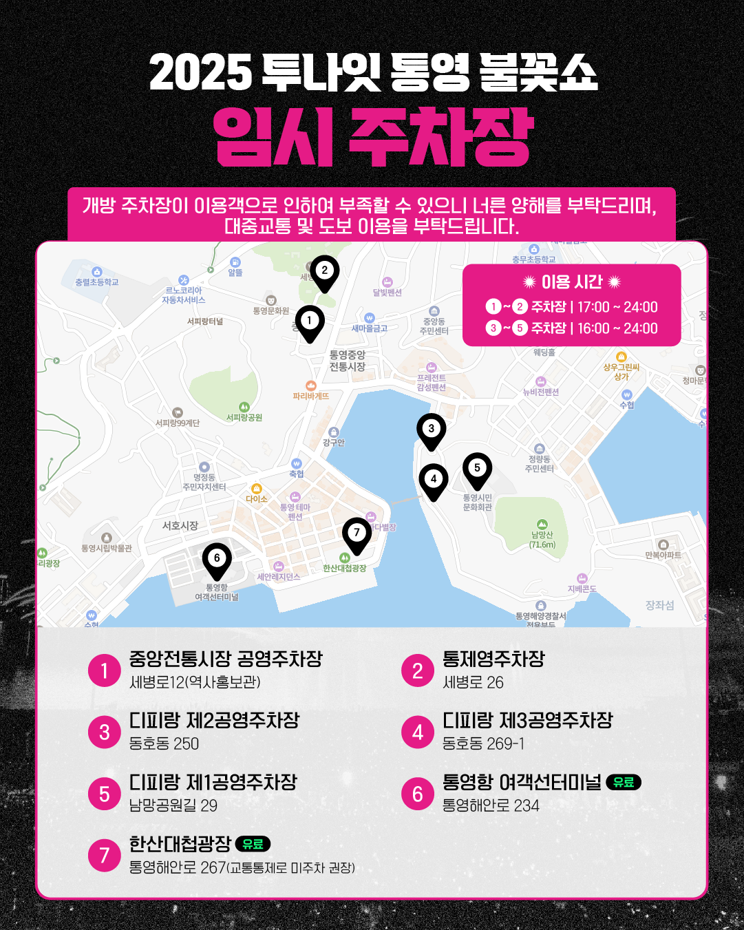 ![]() ![]() [2025 투나잇 통영 불꽃쇼 임시 개방 화장실 및 주차장 안내] 2025 투나잇 통영 불꽃쇼 관람을 위한 임시 개방 화장실 & 주차장 정보를 모아왔어요! 8. 8. (금)부터 8. 13. (수)까지 이용 가능하니 편하게 즐길 준비되셨죠? 개방 주차장이 이용객으로 인하여 부족할 수 있으니 너른 양해를 부탁드리며, 대중교통 및 도보 이용을 부탁드립니다! 주차장 위치 1. 중앙전통시장 공영주차장* 2. 통제영주차장* 3. 디피랑 제2공영주차장** 4. 디피랑 제3공영주차장** 5. 디피랑 제1공영주차장** 6. 통영항 여객선터미널*** 7. 한산대첩광장*** *이용 시간: 17:00 ~ 24:00 **이용 시간: 16:00 ~ 24:00 ***유료 개방 화장실을 최대한 확보하였으나, 다소 부족할 수 있는 점 너그러이 양해 부탁드립니다! 화장실 위치 1. 한산대첩광장 물양장 내* 2. 한산대첩광장 관광안내소 3. 역사홍보관 4. 중앙전통시장 공중화장실 5. 강구안 공중화장실 6. 남망화장실 *이동식 화장실 불꽃만큼 빛나는 여름밤, 통영에서 만나요 TONIGHT TONGYEONG FIREWORKS SHOW 2025. 8. 9. (SAT) 21:30~22:00 in 통영 한산대첩광장 일원 |
