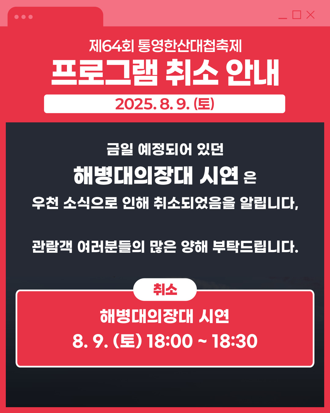 관람을 기대하셨던 여러분께 깊이 양해 부탁드리며,
