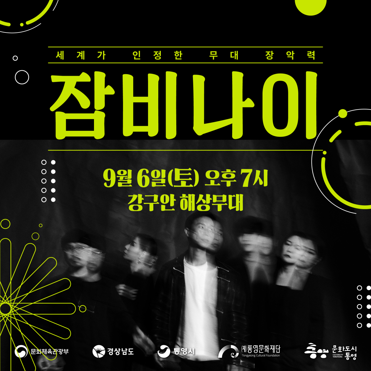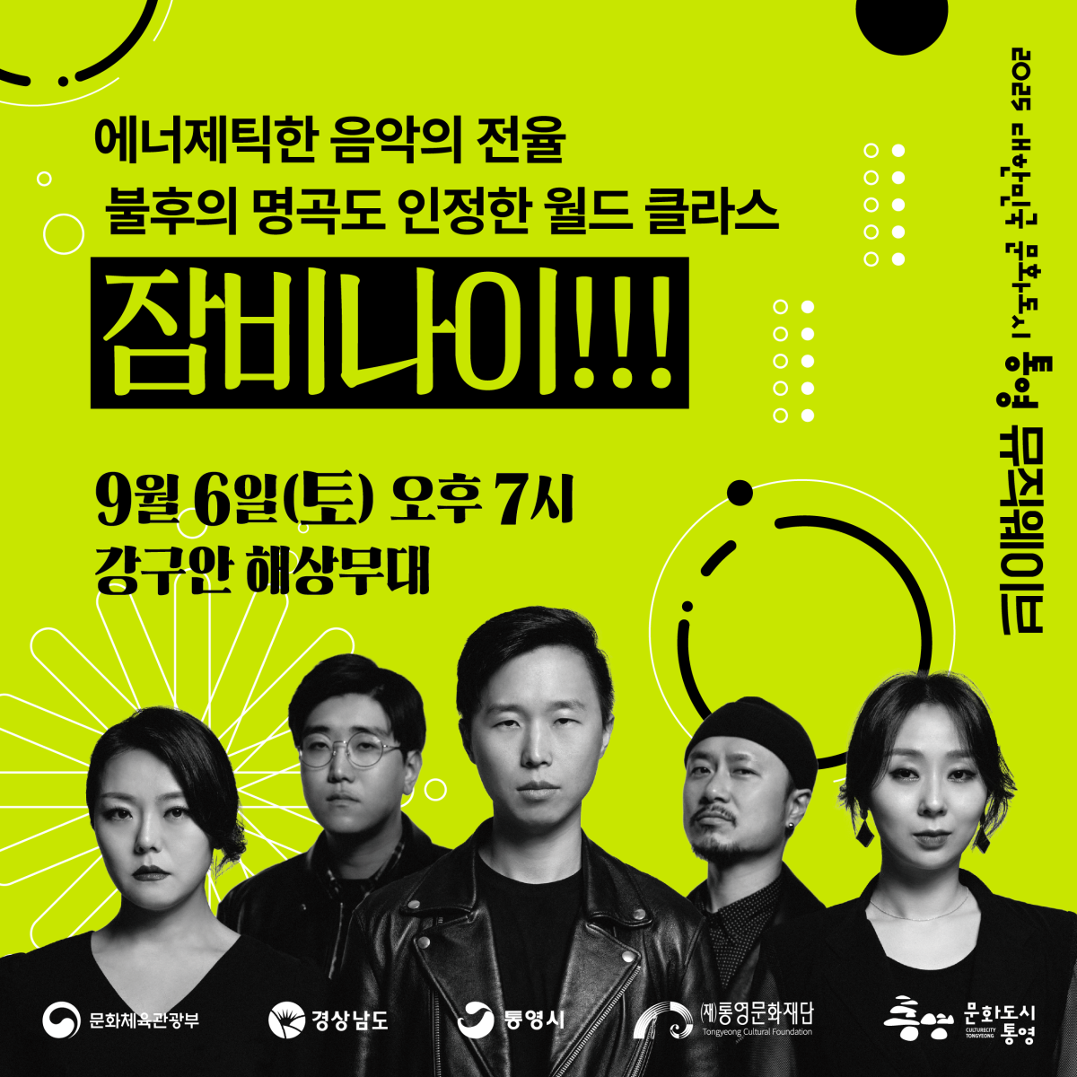 ![]() ![]() ![]() ![]() ![]() 강구안 해상무대에서 만나는 월드클래스 공연! 강구안 해상무대가 에너제틱한 음악의 전율로 가득 찹니다 불후의 명곡에서도 인정한 월드클래스 밴드 잠비나이가 통영 바다를 배경으로 강렬하고 신나는 무대를 선보일 예정이랍니다 이번주말 특별한 공연을 함께 즐기며 통영 바다의 낭만을 즐겨보세요 ◇ 일시: 2025년 9월 6일 (토) ◇ 시간: 오후 7시 ◇ 장소: 강구안 해상무대 ◇ 출연: 잠비나이 |
