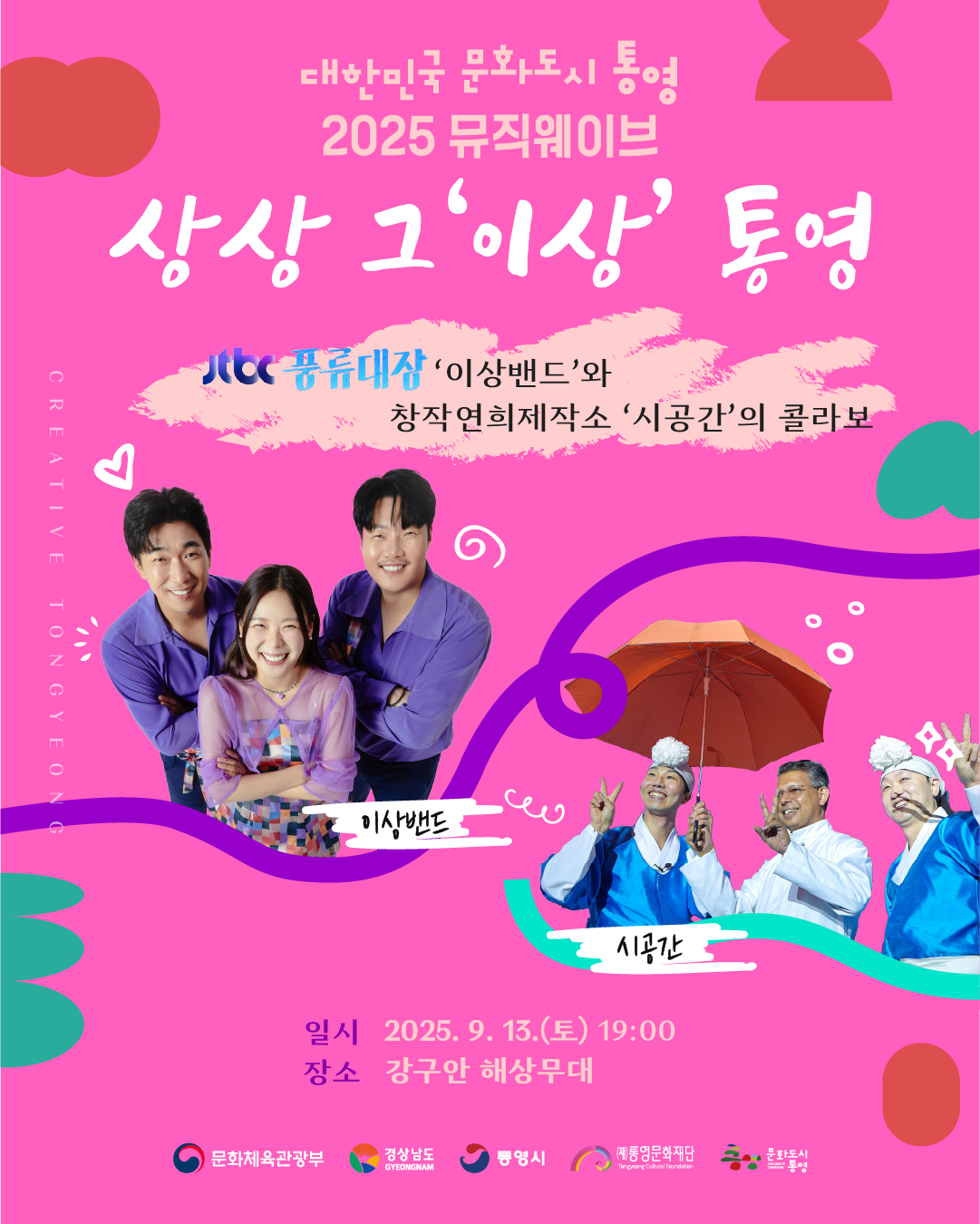 ![]() ![]() ![]() ![]() 2025 뮤직웨이브 이번주말 통영에서 펼쳐지는 특별한 콜라보 공연! JTBC 풍류대장 '이상밴드'와 창작 연희제작소 '시공간'이 만나 강구안 해상무대를 음악과 연희의 공간으로 바꿉니다! ● 일시: 2025.09.13(토) 19:00 ● 장소: 강구안 해상무대 이번 공연에서는 ● 가야금으로 재해석한 감성 플레이리스트 ● 관객과 함께하는 버나놀이 를 통해 한층 더 특별한 음악 경험을 선사합니다 통영의 바다 위에서 울려 퍼지는 선율과 연희의 화려한 퍼포먼스가 어우러진 환상적인 밤! 소중한 사람과 함께 통영의 예술과 문화를 만끽해 보세요 |