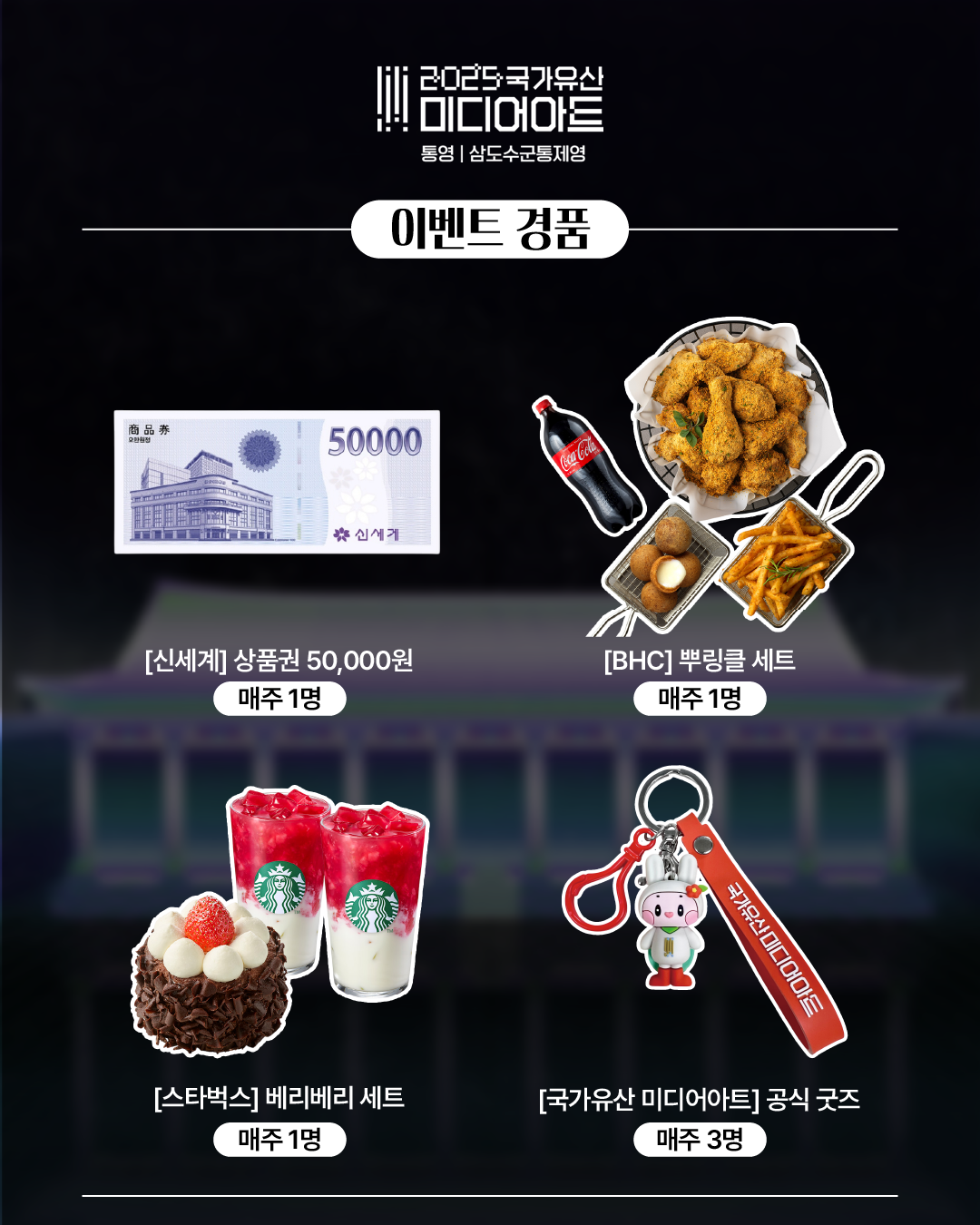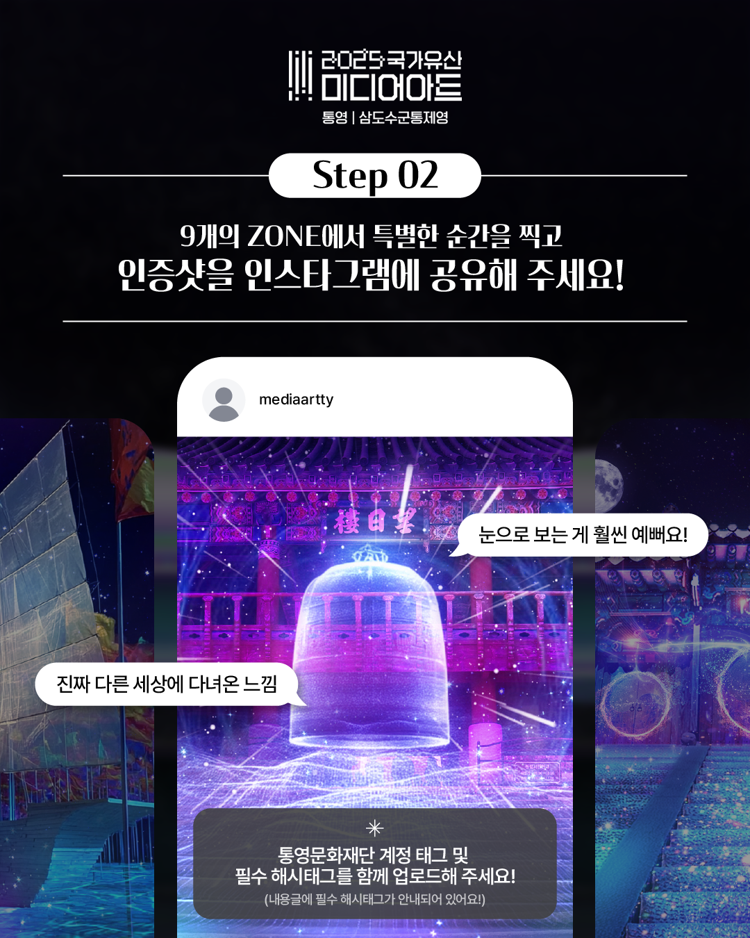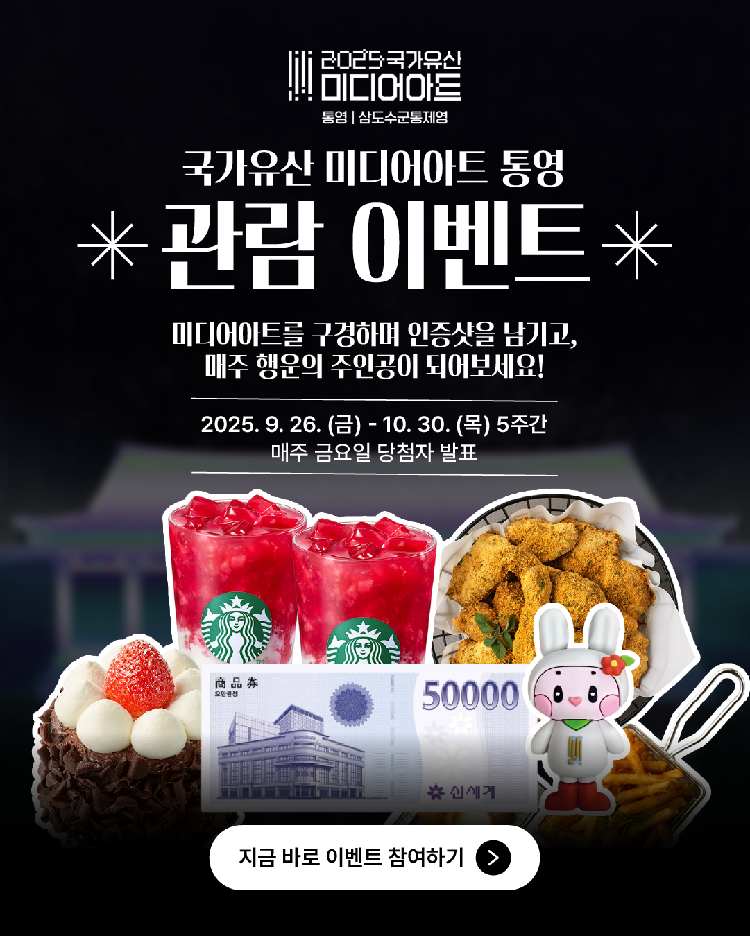 ![]() ![]() ![]() ![]() ![]() 2025 국가유산 미디어아트 통영 | 삼도수군통제영 〈통제영, 평화의 빛〉 관람 이벤트 ! 전시를 즐기고, 인증샷을 남기면 매주 푸짐한 경품이 여러분을 찾아갑니다! 참여 방법은 간단해요! ① 9개의 ZONE에서 마음에 드는 순간을 사진/영상으로 촬영 ② 통영문화재단 계정 태그 및 필수 해시태그와 함께 인스타그램 업로드 * 필수 계정 태그 @tongyeongcf * 필수 해시태그 #2025국가유산미디어아트통영 #통영미디어아트 #통제영평화의빛 #삼도수군통제영 경품 01. [신세계] 상품권 50,000원 (매주 1명) 02. [BHC] 뿌링클+케이준프라이+치즈볼+콜라1.25L (매주 1명) 03. [스타벅스] 베리베리세트 (매주 1명) 04. [국가유산 미디어아트] 공식 굿즈 (매주 3명) 역사와 예술이 빛으로 피어나는 공간, 당신의 특별한 순간을 기록해 보세요! |