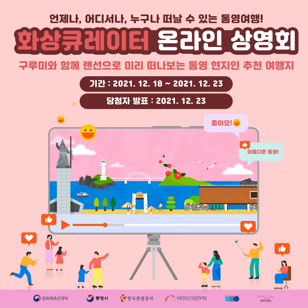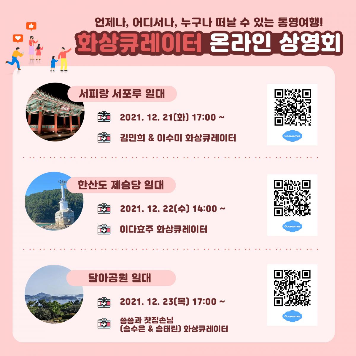 [안내]화상큐레이터 온라인 상영회 ![]() 언제나, 어디서나, 누구나 떠날 수 있는 통영여행! 구루미와 함께 랜선으로 미리 떠나보는 통영 현지인의 따끈따끈한 추천 여행, 화상큐레이터 온라인 상영회에 여러분을 초대합니다! ✔️기간 : 2021. 12. 18 ~ 2021. 12. 23 ![]() ![]() ✔️프로그램 * 뽈뽈이's 화상큐레이터의 해상택시 낭만투어 : 12.19(일) 17:30~ https://biz.gooroomee.com/통영해상택시-야경투어 *박선희 화상큐레이터의 연화도 동백길 : 12.20(월) 14:00~ https://biz.gooroomee.com/연화도-동백길 * 팀통영 화상큐레이터의 윤이상 공원 : 12.21(화) 14:00~ https://biz.gooroomee.com/윤이상기념관 * 김민희&이수미 화상큐레이터의 서피랑 : 12.21(화) 17:00~ https://biz.gooroomee.com/서피랑 * 이다효주 화상큐레이터의 한산도 : 12.22(수) 14:00~ https://biz.gooroomee.com/한산도 * 쑝쑝과 찻집손님 화상큐레이터의 달아공원 : 12.23(목) 17:00~ https://biz.gooroomee.com/달아공원 ✔️참여인원 : 선착순 100명 ✔️참여방법 : 카드뉴스의 QR코드를 확인하세요! * 위 사업은 (주)구루미와 함께하는 화상큐레이터 파일럿지원 사업입니다. 연결 문제가 있을 시 라이브 댓글로 남겨주시면 빠르게 해결해드리겠습니다. 랜선으로 떠나는 신개념 방구석 여행으로 답답한 마음 달래보며 2021년 12월 18일, 12월 20일 오픈되는 카카오톡 채널 이벤트에도 참여해 보세요! |