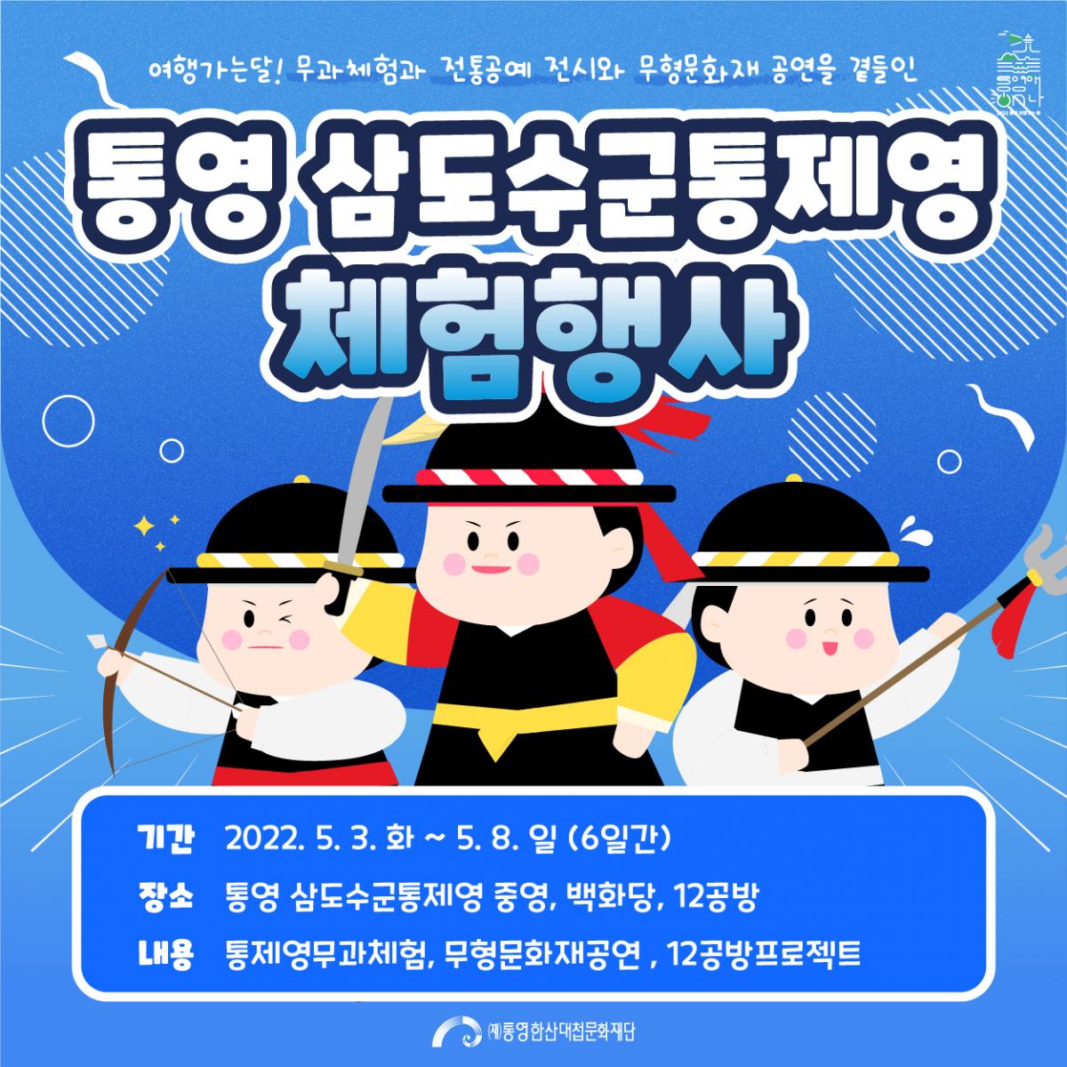 여행가는 달을 맞이해서 통영 삼도수군통제영에도 다양한 체험행사를 준비했습니다! ● 기간 : 2022. 5. 3. 화 ~ 5. 8. 일 (6일간)