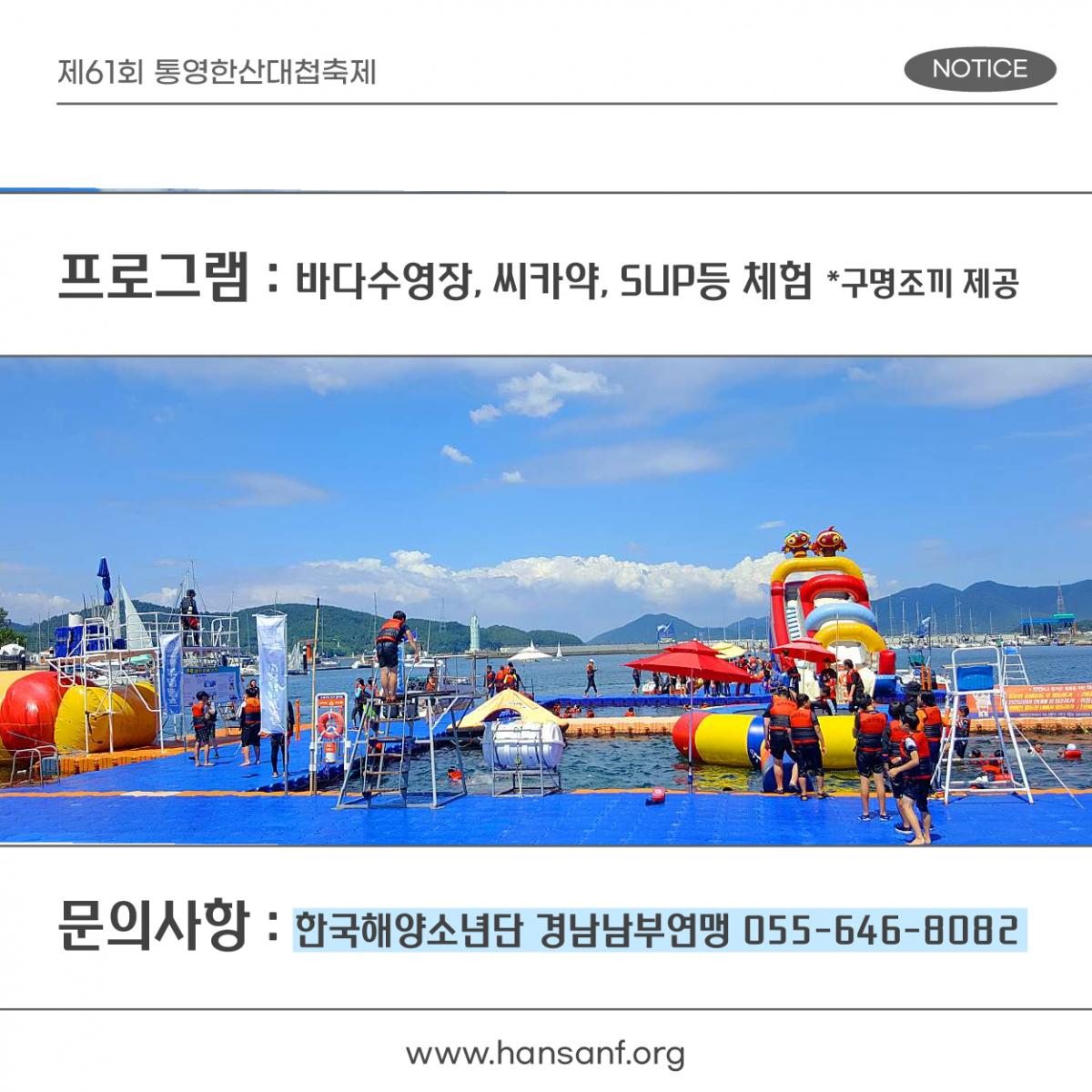 한산대첩 워터파크 해양레져스포츠타운 ![]() ![]() ![]() 한산대첩 워터파크 해양레져스포츠타운 운영기간 : 2022.07.22. - 08.14. 운영장소 : 도남관광단지 이용방법 : 사전예매 (네이버예약) **통영해상택시 : https://booking.naver.com/booking/12/bizes/374667/items/4022833 티켓금액 : 1인 20,000원 *오전권 - 09:30 - 12:30 *오후권 - 14:00 - 17:00 프로그램 : 바다수영장, 씨카약, SUP 등 체험 문의사항 : 한국해양소년단 경남남부연맹 055-646-8082 |