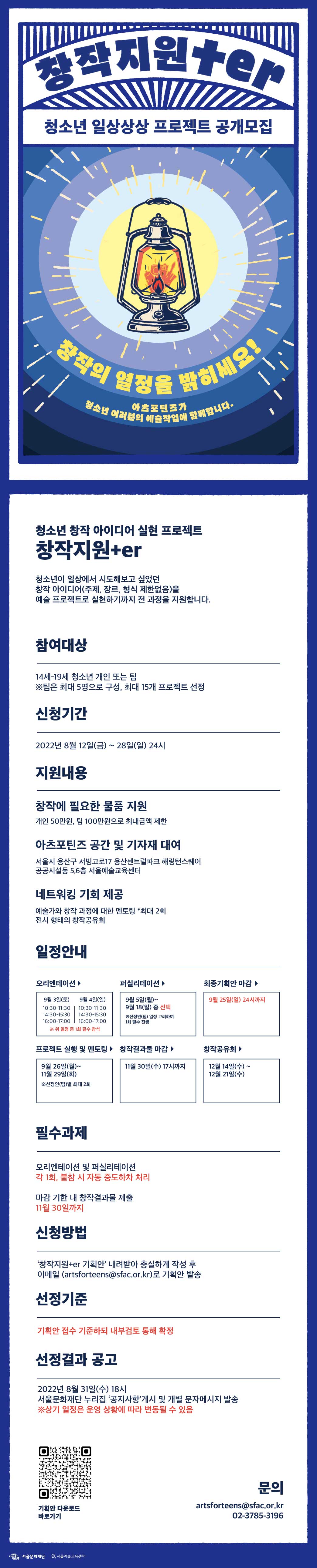 사업 개요 1) 사 업 명 : 2022 청소년 일상상상 프로젝트 ‘창작지원+er(창작지원터)’ 2) 내 용 : 청소년이 일상에서 시도해보고 싶었던 창작 아이디어에 대해 기획부터 실행까지 전 과정 지원 3) 대 상 : 14~19세 청소년 개인 또는 팀 4) 지원내용 : 창작에 필요한 물품 지원, 서울예술교육센터 공간 및 기자재 대여, 네트워킹 기회 제공 5) 필수과제 : 오리엔테이션 및 퍼실리테이션 각 1회씩 참석, 마감기한 내 창작결과물 제출 6) 신청기간 : 2022년 8월 12일(금) ~ 28일(일) 24시까지 7) 신청방법 : 기획안 작성 후 이메일 제출(artsforteens@sfac.or.kr) 문의 : 서울문화재단 예술교육센터팀 정단비 주임(☏ 02-3785-3196) |