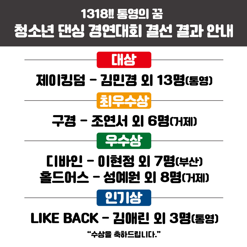 1318!! 통영의꿈 청소년 댄싱 경영대회 결선 결과 안내!