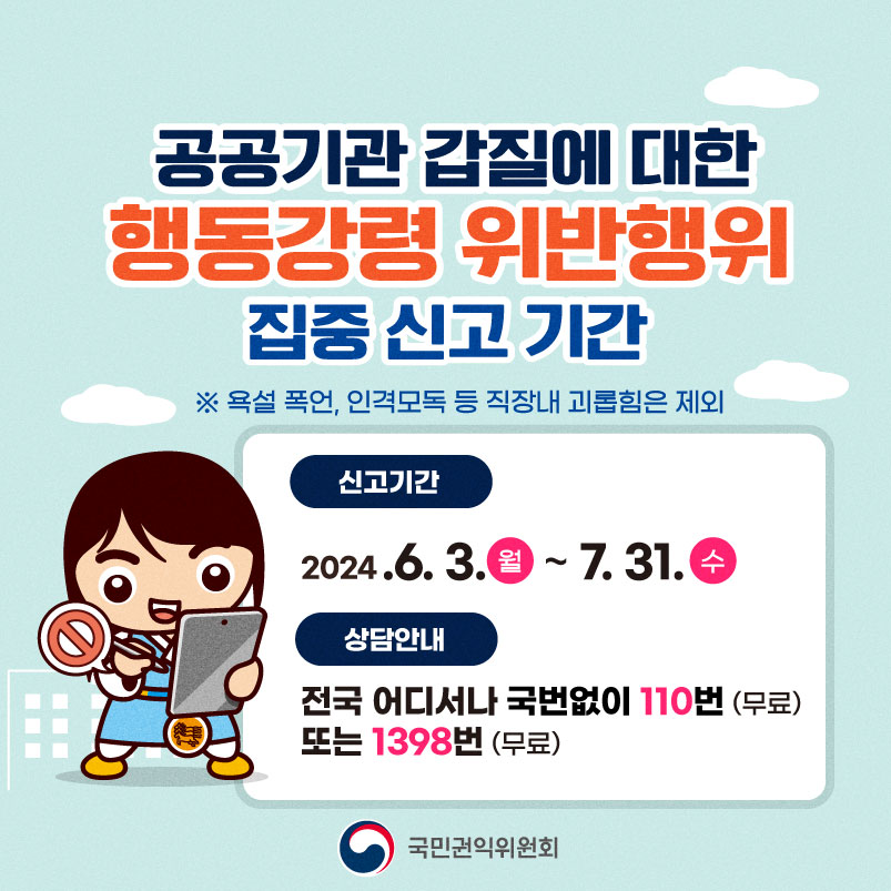 ![]() ![]() 공공기관 갑질에 대한 행동강령 위반행위 집중신고기간 ♣기간 : 2024. 6. 3. (월) ~ 7. 31.(수) ♧대상 - 민원인 · 계약업체 · 부하직원에게 직무권한 등을 행사한 부당행위 - 사적노무 요구 - 감독기관의 부당한 요구 등 공공기관의 직무상 갑질행위 ※욕설, 폭언, 인격모독, 따돌림, 성희롱 등 직장내 괴롭힘은 제외 ☎상담안내 전국 어디서나 국번없이 110번 또는 1398번 (무료) |