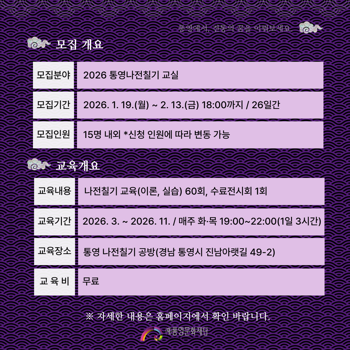 : 나전칠기교육(이론,실습)60회, 수료전시회 1회