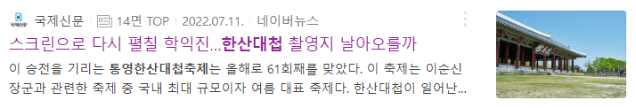 [국제신문] 스크린으로 다시 펼칠 학익진 한산대첩 촬영지 날아오를까