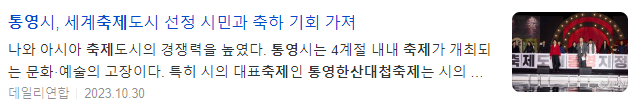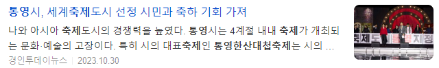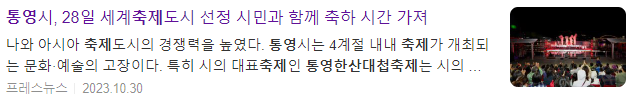 통영시는 지난 11일(미국현지시간) 미국 텍사스주 매캘런시에서 개최된 제66회 세계축제협회 연차총회에서 '세계축제도시'로 선정됐다. 대한민국 통영시를 포함해 태국 수코타이주, 미국 펜실베니아주 필라델피아, 미국 텍사스주 매캘런 총 4개 도시가 2023 세계축제도시에 선정되면서 전체 세계축제도시 중 절반이 아시아권에서 나와 아시아 축제도시의 경쟁력을 높였다.
