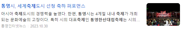 이 날 ‘2023 세계축제도시 통영 지정을 축하합니다’라는 글자판으로 퍼포먼스를 선보여 관람객과 시민대표와 함께 세계축제도시 지정을 축하했다.