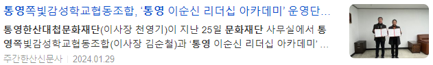 한편, 향후 2년간 「통영 이순신 리더십 아카데미」를 위탁운영을 맡은 쪽빛감성학교협동조합은 수익금 일부를 사회공헌 사업으로 환원하기 위해 통영한산대첩문화재단과 지역의 문화예술 사업 발굴 및 추진하기로 합의했다.