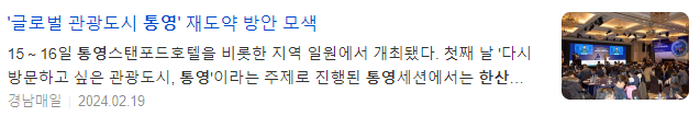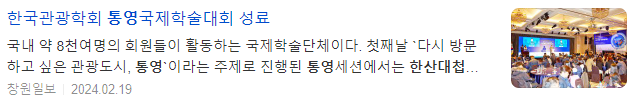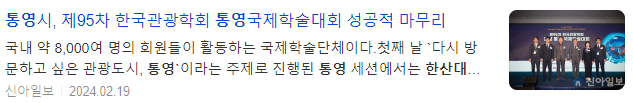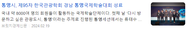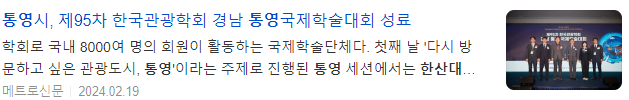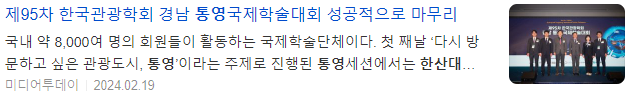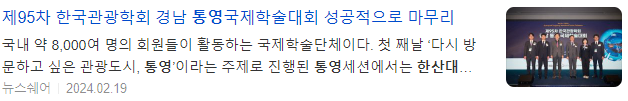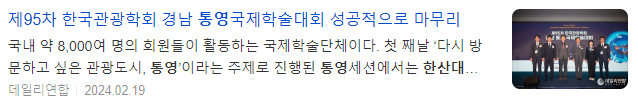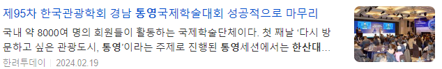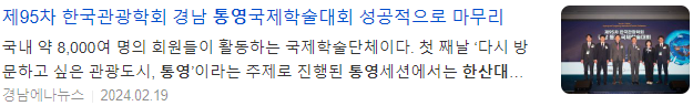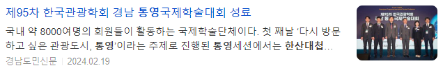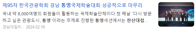 통영시와 경상남도가 후원하고 한국관광학회가 주최하는 '제95차 한국관광학회 경남 통영국제학술대회'가 국내·외 관광 전문가와 학생 등 400여 명이 참석한 가운데 지난 15~16일 이틀간 통영스탠포드호텔을 비롯한 지역 일원에서 개최됐다.