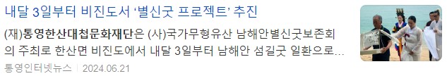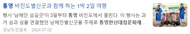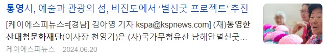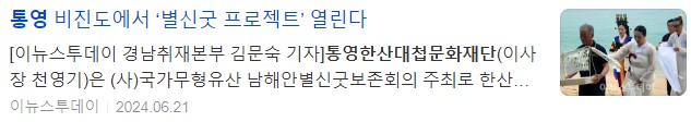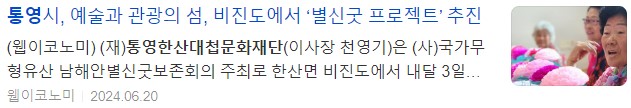 (재)통영한산대첩문화재단(이사장 천영기)은 (사)국가무형유산 남해안별신굿보존회의 주최로 한산면 비진도에서 내달 3일부터 ‘남해안 섬길굿’ 일환으로 전시, 투어, 공연 등 다양한 프로그램을 운영한다.