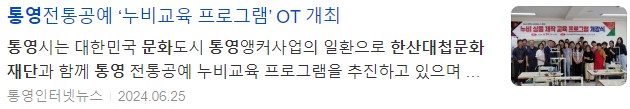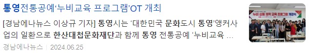 박행오 문화예술과장은 “이 교육을 통해 통영 전통공예를 많은 분들에게 알릴 수 있는 기회가 되면 좋겠다”며 “열심히 참석하셔서 좋은 결과물로 향후 있을 대한민국 문화도시 최종 지정에 보탬이 되어 주시길 당부 드린다”고 전했다.