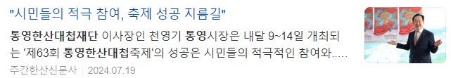 오후 8시에는 통영 현역가왕 트로트 축하공연이 성황리에 개최된다. 진해성, 박해신, 이하린, 싸이버거, 팝페라 가수 송클레어가 출연, 축제의 열기를 더욱 뜨겁게 달굴 예정이다.