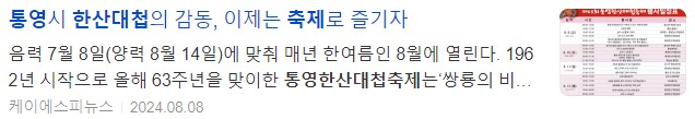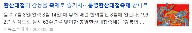 통영시의 대표 축제이자 정부지정 명예문화관광축제인 통영한산대첩축제는 이순신 장군이 임진왜란 때 한산도 앞바다에서 왜적 수군을 상대로 대승을 거둔 '한산대첩'을 기념하는 축제로 한산대첩 승전일인 1592년 음력 7월 8일(양력 8월 14일)에 맞춰 매년 한여름인 8월에 열린다.