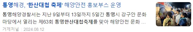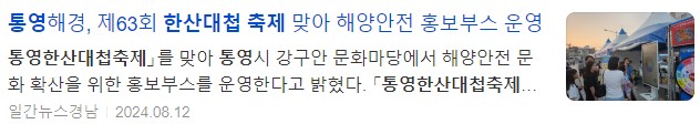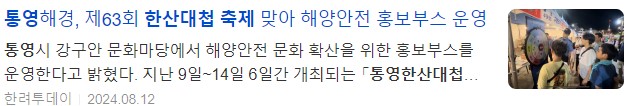 통영해양경찰서는 9일부터 13일까지 5일간 통영시 강구안 문화광장에서 열리는 제63회 통영 한산대첩축제를 기념해 해양안전문화를 확산하기 위한 홍보 부스를 운영한다.