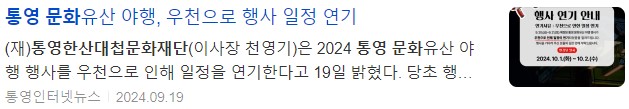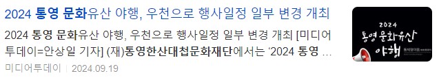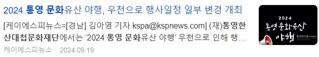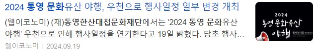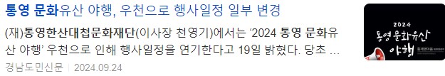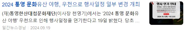 (재)통영한산대첩문화재단(이사장 천영기)에서는 ‘2024 통영 문화유산 야행’ 우천으로 인해 행사일정을 연기한다고 19일 밝혔다.