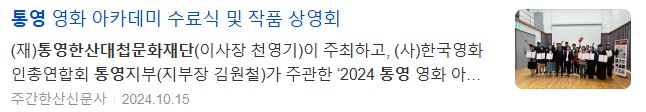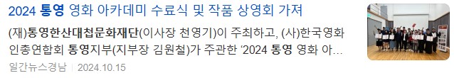 한편, 2024 통영 영화 아카데미를 수료한 진채원(여, 통영시 미수동)씨가 교육 기간 중인 지난 7월 경상남도와 (재)경남문화예술진흥원에서 공모한 ‘2024 경남 신진감독 제작 지원사업’에 선정돼 내달 통영일원에서 본격적인 영화 촬영에 들어가며, 통영 영화 아카데미 1기 수료생들도 함께 참여할 예정이다.
