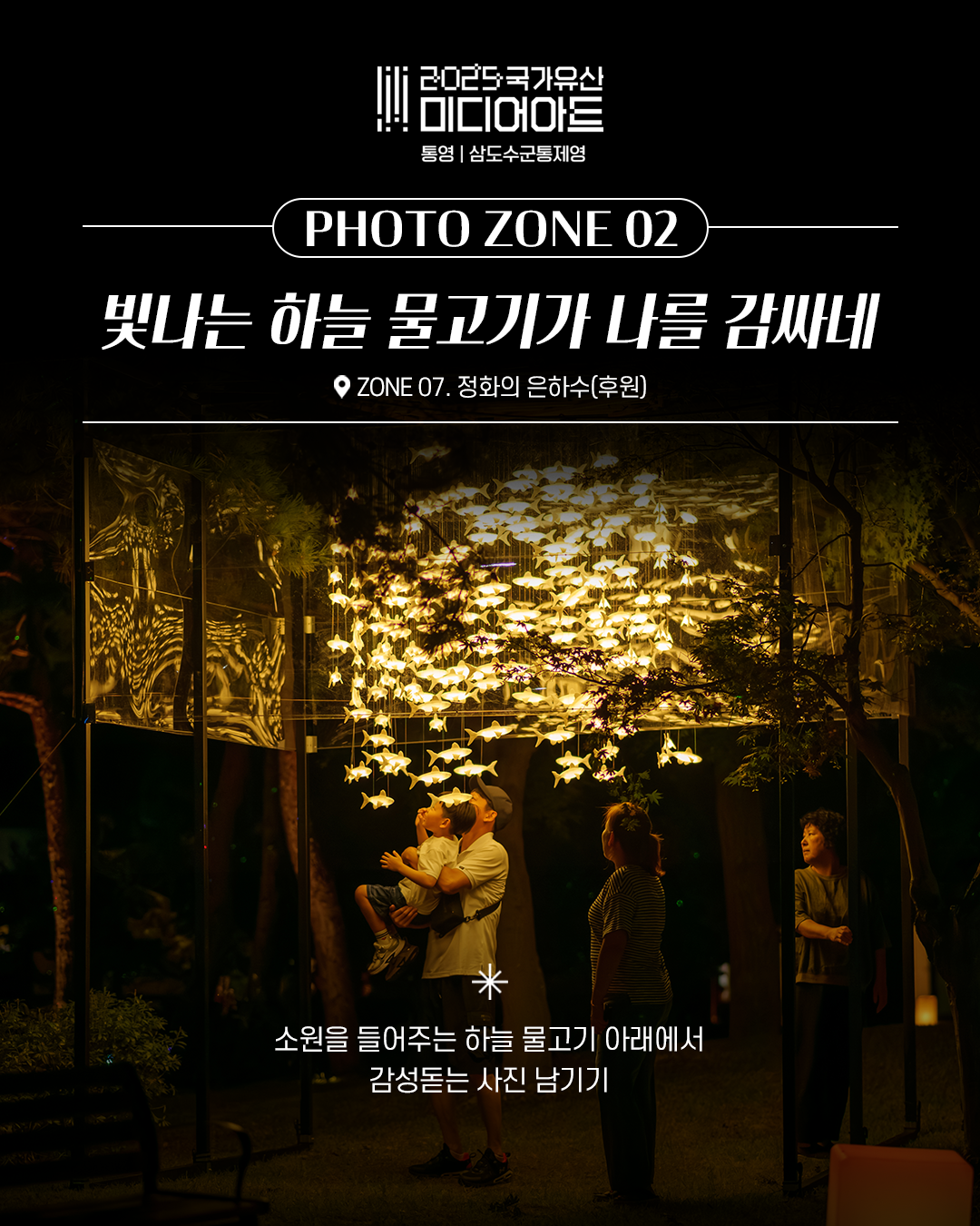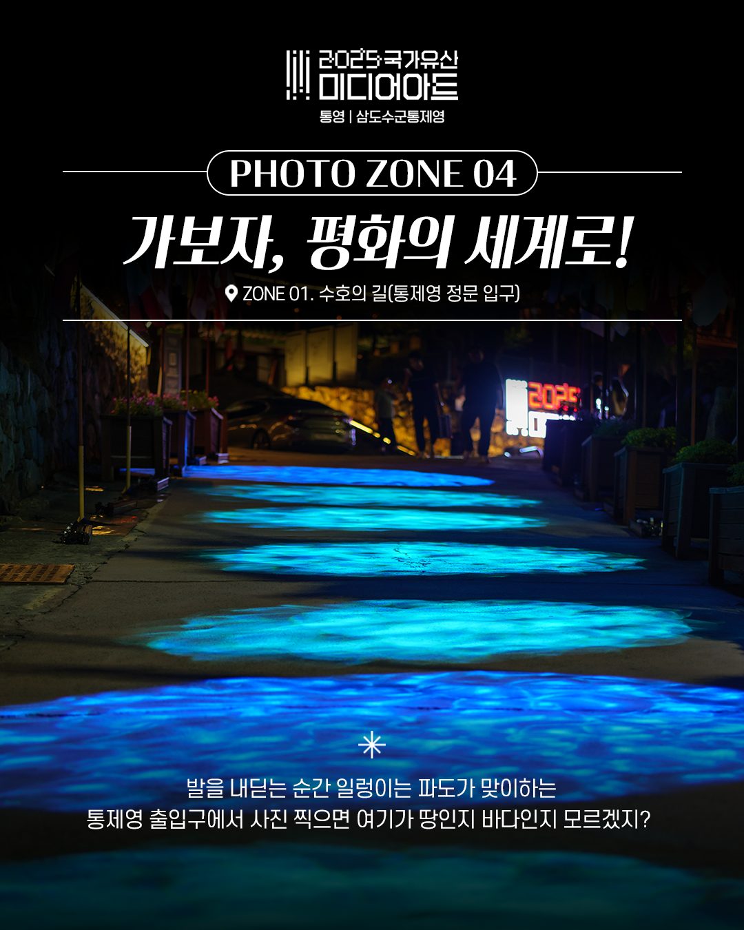 ![]() ![]() ![]() ![]() ![]() ![]() 2025 국가유산 미디어아트 통영 | 삼도수군통제영 〈통제영, 평화의 빛〉 삼도수군통제영 인생샷 스팟 대공개! 조선 수군의 숨결과 빛으로 물든 미디어아트 공간에서 멋진 추억과 사진을 남겨보세요 ① HIDDEN SPACE. 수호의 서약 그림자 포토존에서 위풍당당 수군처럼! ② ZONE 07. 정화의 은하수 빛나는 하늘 물고기 아래 감성샷 ③ ZONE 02. 맹세의 바다 판옥선과 깃발 사이, 색다른 무드 ④ ZONE 01. 수호의 길 일렁이는 파도에 들어서는 순간 ⑤ 망일루 옆 타이틀 포토존 방문 인증샷은 여기서 확실하게! 빛과 역사가 만난 자리, 당신의 인생샷을 완성하세요! ● 통영 삼도수군통제영 (세병로 27) ● 2025.9.26.(금) ~ 10.26.(일) / 31일간 ● 매일 19:00 ~ 21:30 |