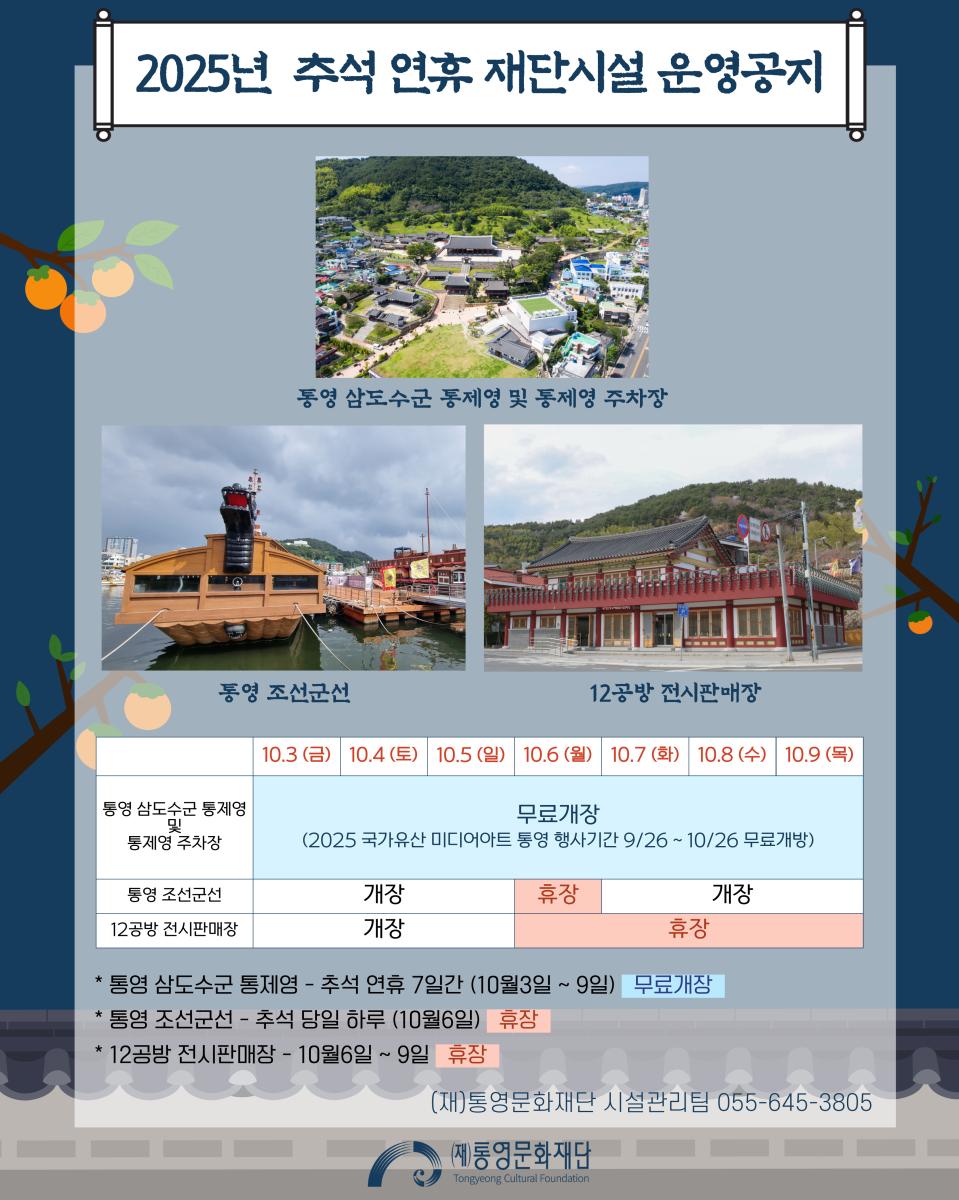 ![]() ※ 2025 추석 연휴 재단시설 운영 안내 안녕하세요 통영문화재단 재단시설 추석 연휴 운영 일정을 알려드립니다! * 통영 삼도수군 통제영 & 주차장 10/3(금) ~ 10/9(목) 연휴 전 기간 무료 개장 (9/26~10/26 국가유산 미디어아트 통영 행사 기간 무료개장) * 통영 조선군선 10/3(금) ~ 10/5(일) 개장 10/6(월, 추석 당일) 휴장 10/7(화) 이후 정상 개장 * 12공방 전시판매장 10/3(금) ~ 10/5(일) 개장 10/6(월) ~ 10/9(목) 휴장 풍성한 한가위 되시길 바라며 많은 방문과 관심 부탁드립니다! ☎ 문의: (재)통영문화재단 시설관리팀 055-645-3805 |