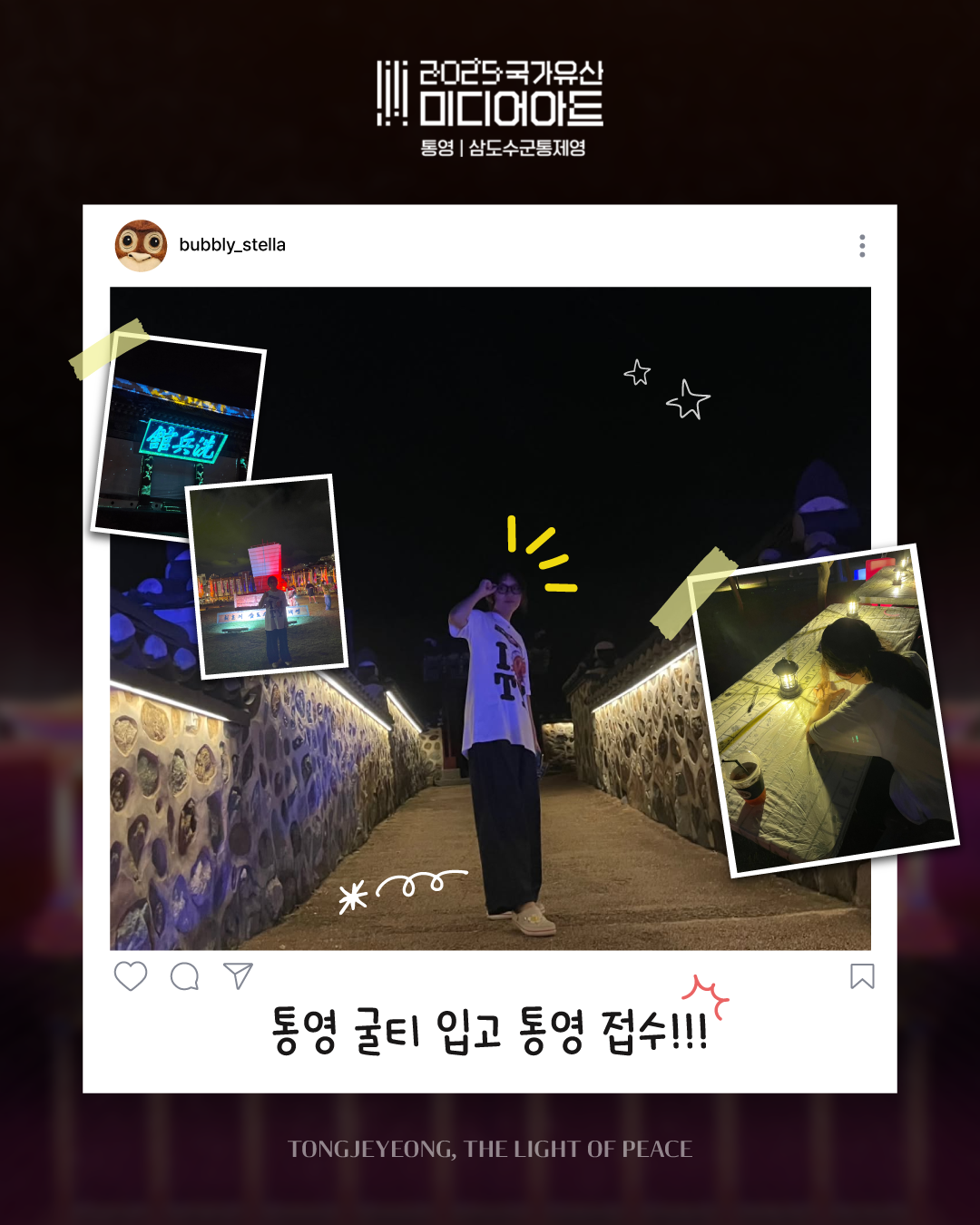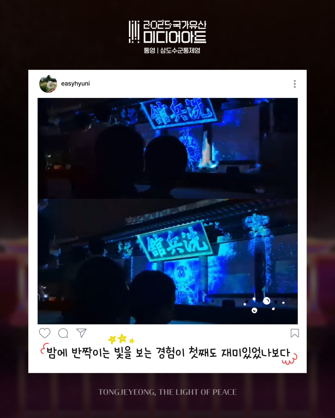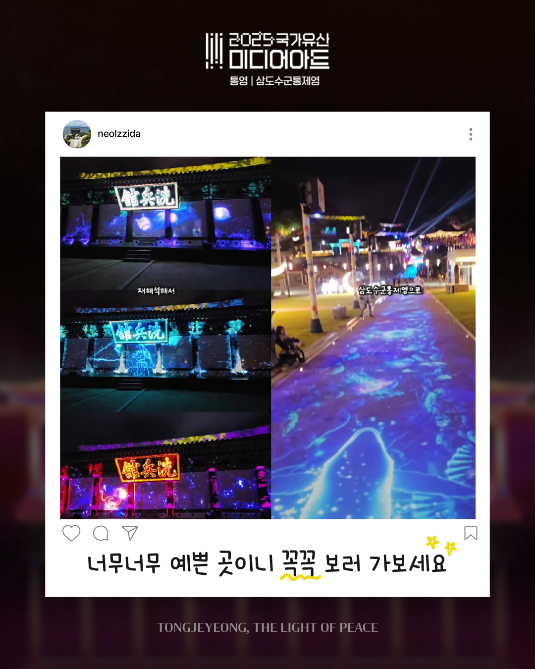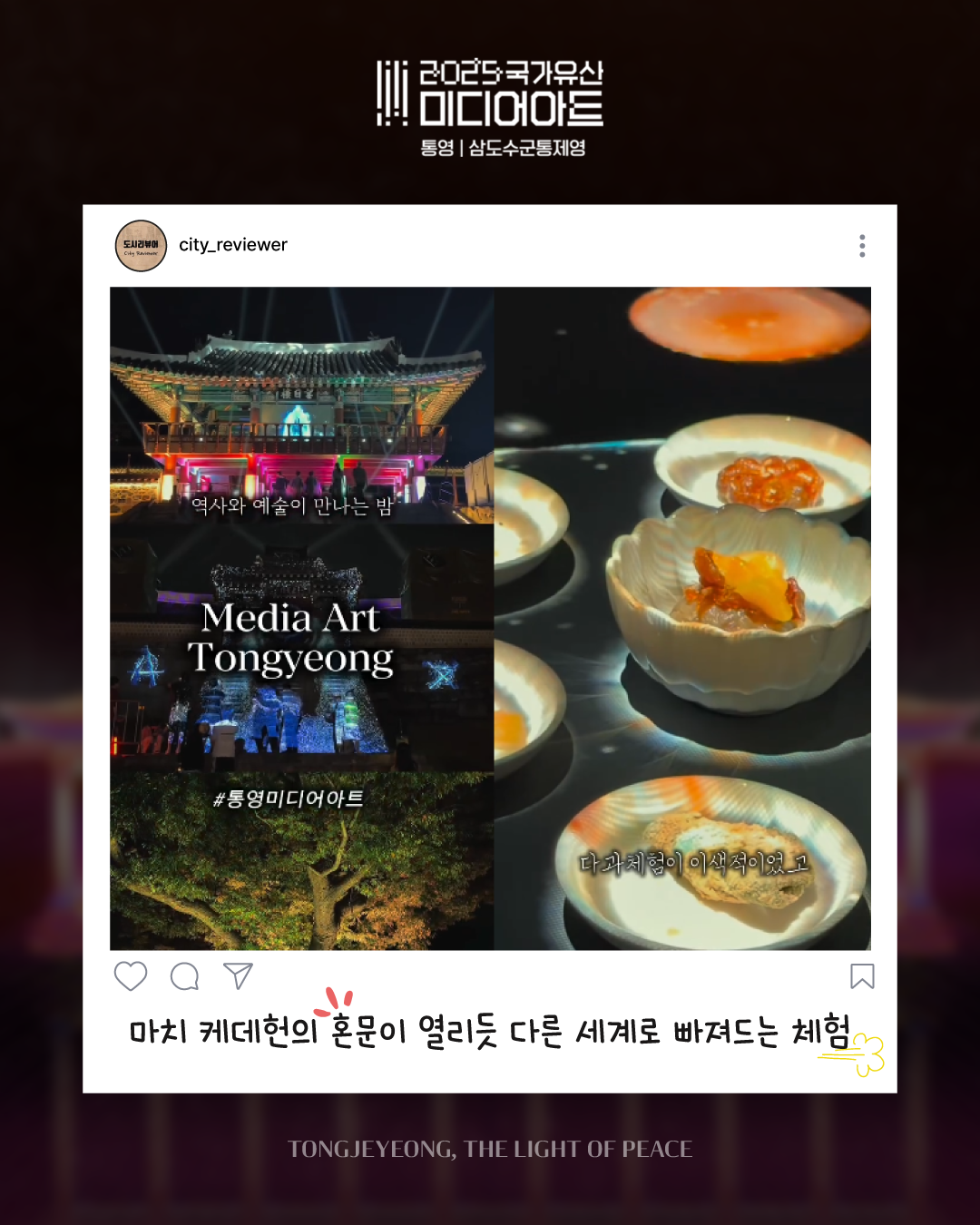 ![]() ![]() ![]() ![]() ![]() ![]() 2025 국가유산 미디어아트 통영 | 삼도수군통제영 〈통제영, 평화의 빛〉 관람 후기 : 아름다운 공간, 통제영에서 만든 추억을 생생한 후기로 남기고 공유해보세요! 관람 후기 공유 방법! ① 9개의 ZONE에서 추억으로 남긴 사진/영상을 선택 ② @tongyeongcf 태그 및 필수 해시태그와 함께 인스타그램 업로드 ◆ 필수 계정 태그 @tongyeongcf ◆ 필수 해시태그 #2025국가유산미디어아트통영 #통영미디어아트 #통제영평화의빛 #삼도수군통제영 통영의 밤, 그 빛 속에 당신의 추억을 더하세요 당신의 한 컷이 통제영의 또 다른 빛이 됩니다. |