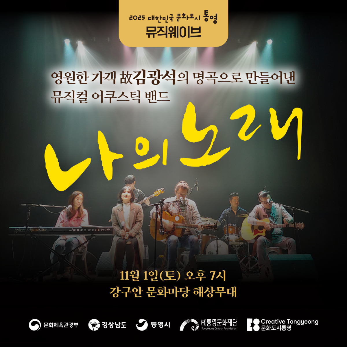 ![]() ![]() ![]() ![]() 영원한 가객, 故 김광석의 명곡으로 꾸며지는 감동의 무대! 추억을 노래하는 어쿠스틱 밴드와 함께 깊어가는 가을밤, 감성을 채워보세요. ⠀ - 일시: 11월 1일(토) 오후 7시 - 장소: 강구안 문화마당 해상무대 (통영) - 출연진: 김재한, 홍현진, 장인훈, 안상현, 임상일, 정한별, 임유진, 장대성 - 대표곡: 바람이 불어오는 곳, 나의 노래, 사랑했지만, 두바퀴로 가는 자동차 등 ⠀ 통영의 바다를 배경으로 펼쳐지는 감성 뮤지컬 콘서트, !! 어쿠스틱밴드 <나의 노래>와 함께하세요 |